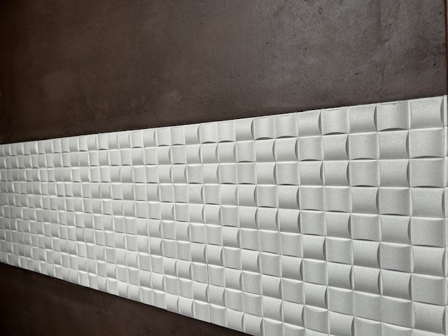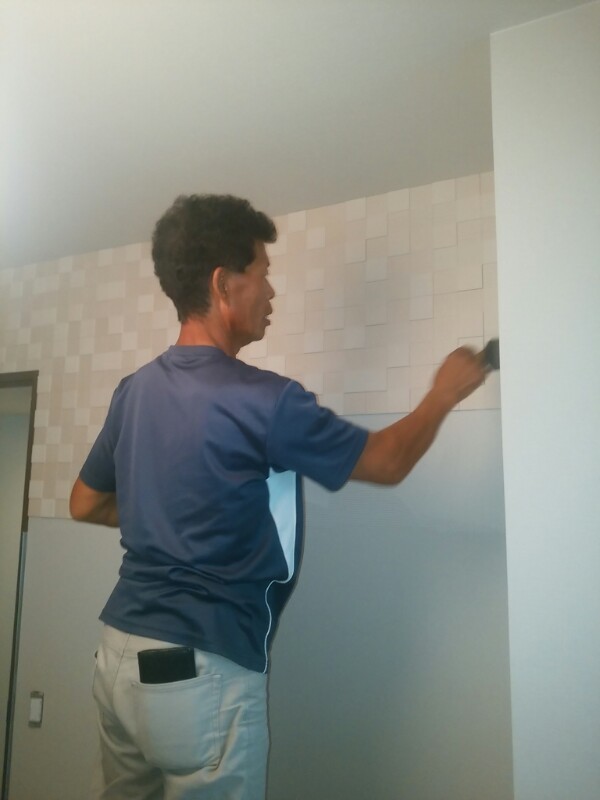 新築のマンションの洗面所のクロス壁に、モザイクタイル張りのご依頼と、寝室のクロス壁の一面にエコカラット張りのご依頼も合わせていただきました。タイル張りだけの工事ですが、やはり工事の音が出てしまいます。マンションということで、H様宅の上下左右のお宅に工事のご挨拶に伺い、工事を行いました。洗面所に張るモザイクタイルは、H様が色割合を決められました。モザイクタイルは色割合の範囲でランダムに配置され、1シートになり納品されます。全体にタイルを張り、H様のイメージ通りになるよう色タイルの配置を1つ1つ変更していきました。