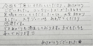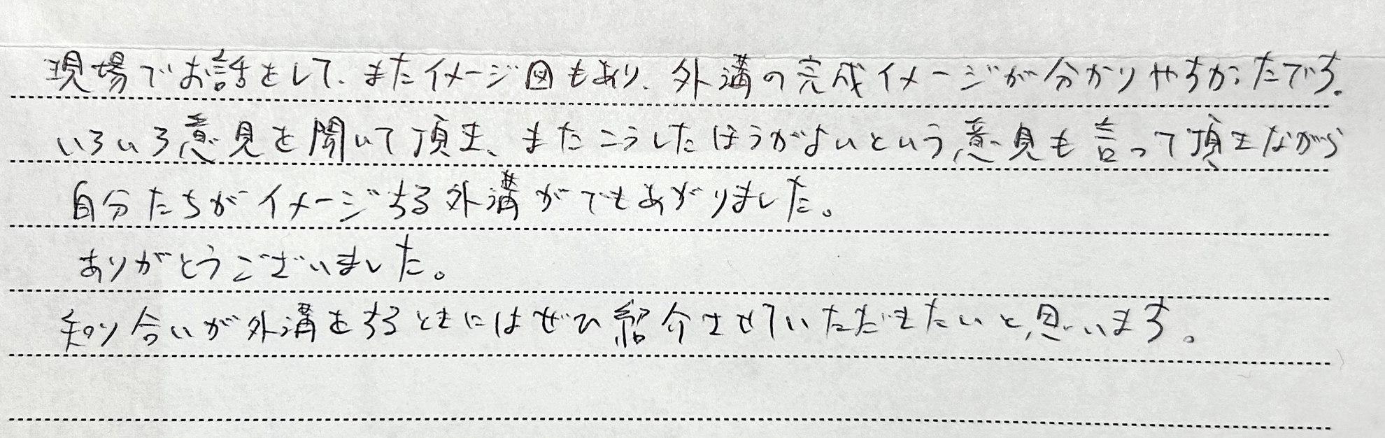 現場でお話をして、またイメージ図もあり、外構の完成イメージが分かりやすかったです。いろいろ意見を聞いて頂き、またこうした方がよいという意見も言って頂きながら、自分たちがイメージする外構ができあがりました。ありがとうございました。知り合いが外構をする時には、ぜひ紹介させていただきたいと思います。