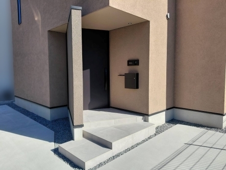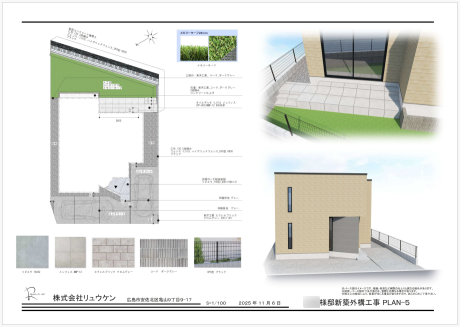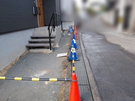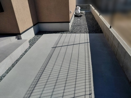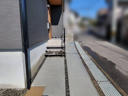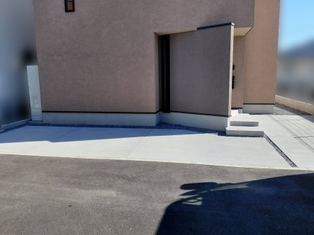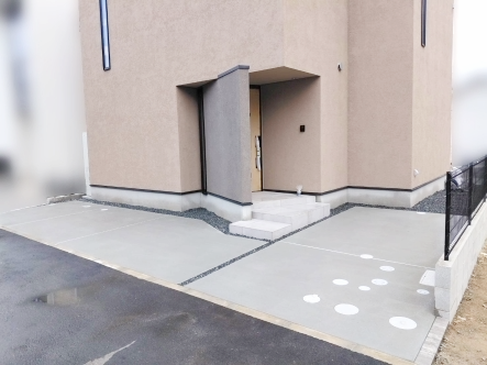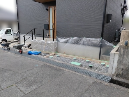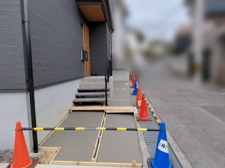 以前、工事をさせていただいたお客様のご紹介で、I様より新築外構工事のご依頼をいただきました。 お見積りやイメージパースの修正などの打ち合わせは主にメールで行い、I様のご要望に沿えるよう、内容を確認しながら進めさせていただきました。工事直前には、現地にてイメージパースをもとに最終確認し、仕上がりのイメージを共有しました。
