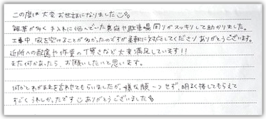 この度は、大変お世話になりました。雑草が多く、手入れに悩んでいた裏庭や駐車場廻りがスッキリして助かりました。工事中、家を空けることが多かったのですが、柔軟に対応してくださり、ありがとうございます。近所への配慮や作業の丁寧さなど大変満足しています。また何かあったら、お願いしたいと思います。何かとわがままを言わせてもらいましたが、嫌な顔一つせず、明るく接してもらえて、すごく嬉しかったです。ありがとうございました。