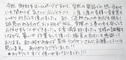 今回、御社をホームページで知り、突然の電話での問い合わせにも関わらず、気さくに応じて下さり、二度三度の見積り変更等も、しっかり対応して頂けました。また、ご近所さんへの対応も明るく誠意のあるもので、お人柄が伺え、実際の工事の方も、安心してお任せすることができました。大変満足致しました。天候の調整もしながら、暑い中作業をして頂いた職員の方々にも、感謝しております。また何かあれば、是非、リュウケンさんにお願いしたいと思います。ありがとうございました!!☆スッキリしてすごく使いやすくなりました!!