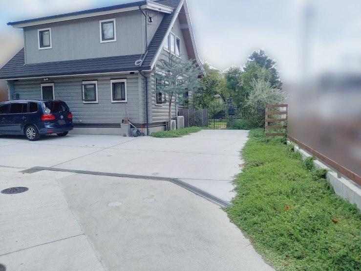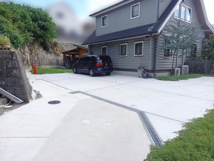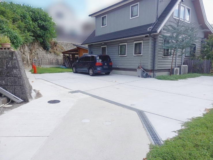 駐車場をコンクリートにしたいとご依頼がありました。K様宅への道路は、大きなミキサー車が入れない為、小型のミキサー車を使用し、コンクリート打設は3回に分けて施工しました。