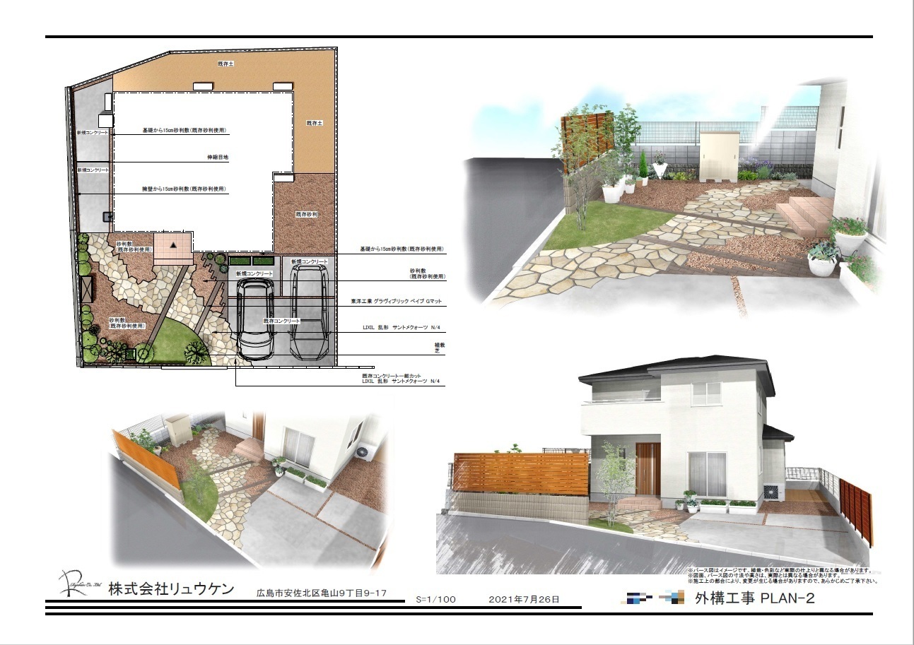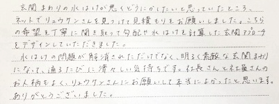 玄関まわりの水はけが悪く、どうにかしたいと思っていたところ、ネットでリュウケンさんを見つけて見積りをお願いしました。こちらの希望を丁寧に聞き取って、勾配や水はけを計算した玄関アプローチをデザインしていただきました。水はけの問題が解消されただけではなく、明るく素敵な玄関まわりになって、通るたびに清々しい気持ちです。社長さんと社員さんのお人柄も良く、リュウケンさんにお願いして本当に良かったと思います。ありがとうございました。