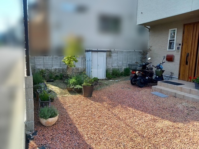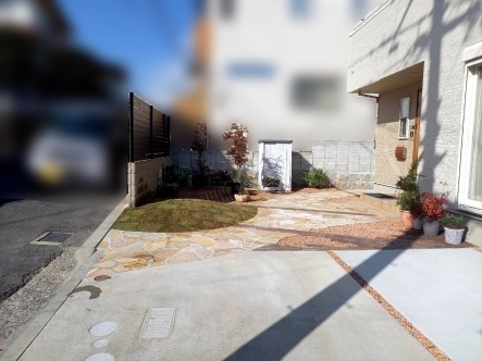 道路から玄関までのアプローチが砂利敷きで歩きづらく、水はけも悪いので、何とかしたい。と、ご相談がありました。S様宅には、綺麗なお花などの鉢が沢山あり、その鉢を綺麗に飾れるよう、S様のご要望に添ったプランのご提案をいたしました。アプローチの空いた部分に、既存のカラー砂利を再利用しました。