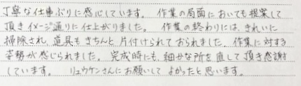 丁寧な仕事ぶりに感心してます。作業の局面においても、提案して頂きイメージ通りに仕上がりました。作業の終わりには、きれいに掃除され、道具もきちんと片付けておられました。作業に対する姿勢が感じられました。完成時にも、細かな所を直して頂き、感謝しています。リュウケンさんにお願いしてよかったと思います。