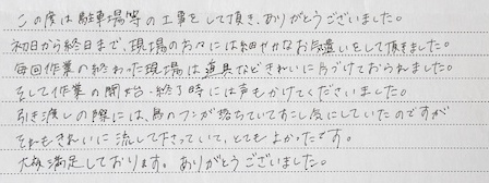 この度は駐車場等の工事をして頂き、ありがとうございました。初日から終日まで、現場の方々には細やかなお気遣いをして頂きました。毎回の作業の終わった現場は、道具などきれいに片づけておられました。そして、作業の開始・終了時には声もかけてくださいました。引き渡しの際には、鳥のフンが落ちていて少し気にしていたのですが、それもきれいに流して下さっていて、とてもよかったです。大変満足しております。ありがとうございました。
