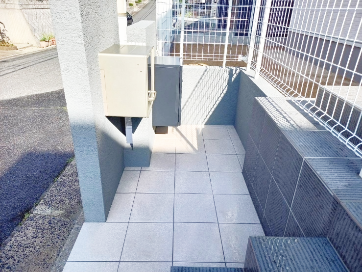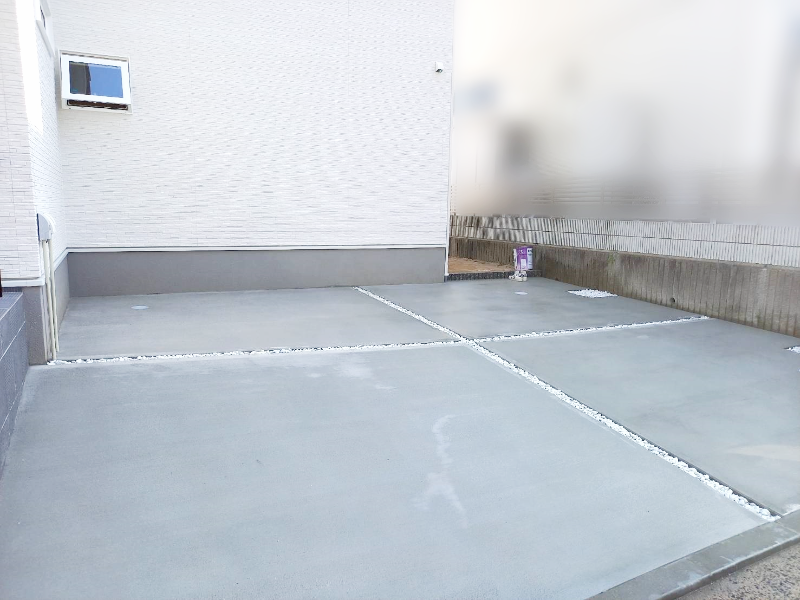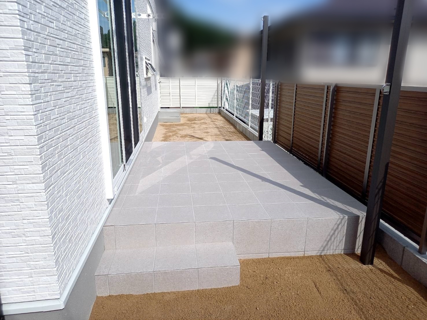 新築外構工事のご依頼がありました。最近、弊社でもご希望される方が多くなってきている宅配ボックス。 K様も宅配ボックスをご希望でしたので、塀に埋め込みました。庭側には、目隠しフェンス・タイルデッキ・タープ用のアルミ柱を設置しました。数年後にカーポートの設置予定との事でしたので、土間打ちをする際、排水等の埋め込み・カーポートの柱位置などを考慮し、コンクリートを打設しました。