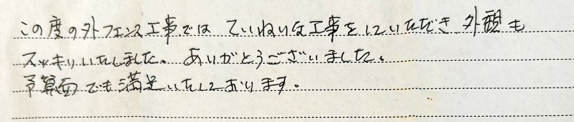 この度の外フェンス工事では、ていねいな工事をしていただき外観もスッキリいたしました。ありがとうございました。